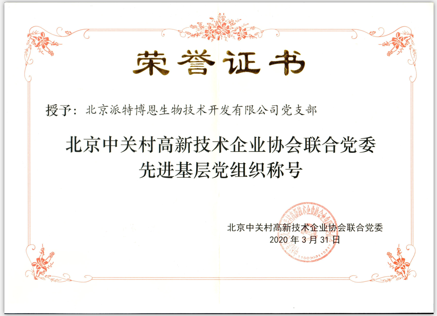 派特公司黨支部自2019年4月15日成立以來,在上級黨組織的領(lǐng)導下,在派特公司總部領(lǐng)導的大力支持下,積極有序地開展了各項黨員活動。 派特公司黨支部榮獲“北京中關(guān)村高新技術(shù)企業(yè)協(xié)會聯(lián)合黨委先進基層黨組織稱號”。