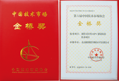 2013年,“派特靈應(yīng)用HPV感染防治技術(shù)項(xiàng)目”榮獲第六屆金橋獎(jiǎng)優(yōu)秀項(xiàng)目獎(jiǎng)。