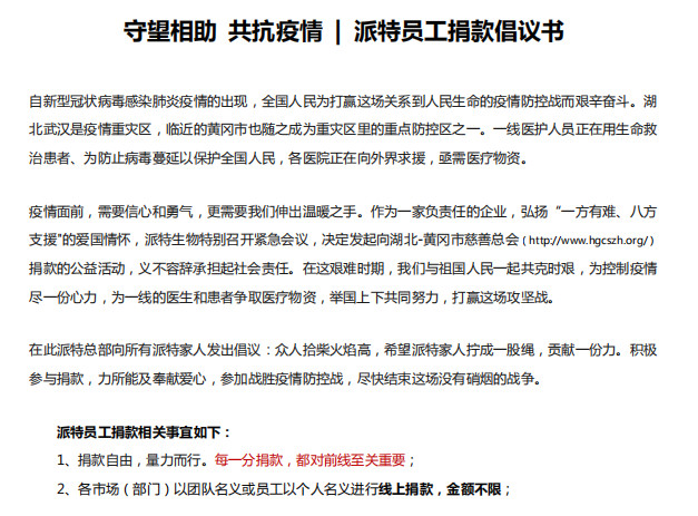 2月11日,派特公司通過(guò)黃岡市慈善總會(huì)向湖北黃岡市抗擊疫情捐款37萬(wàn)余元,全力支持黃岡市疫情防控工作。