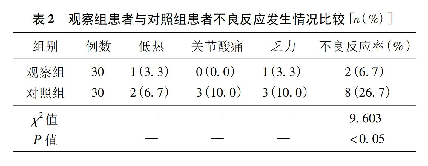 對患者不良反應予以隨訪觀察,發(fā)現(xiàn)觀察組患者不良反應率為6.7%,較對照組患者的26.7%低,差異具有統(tǒng)計學意義(P<0.05)。