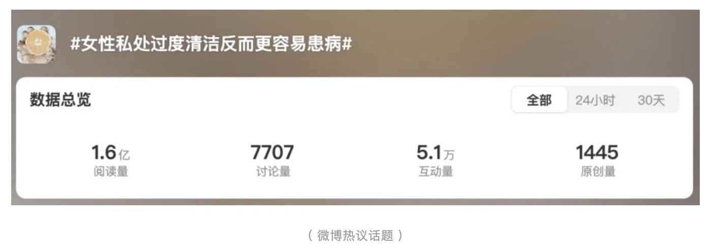 最近,微博上的一條熱搜引起了大家的關(guān)注——“女性私處過度清潔反而更容易患?。?/strong>”。截止截稿,該話題已被1.6億人瀏覽、討論。